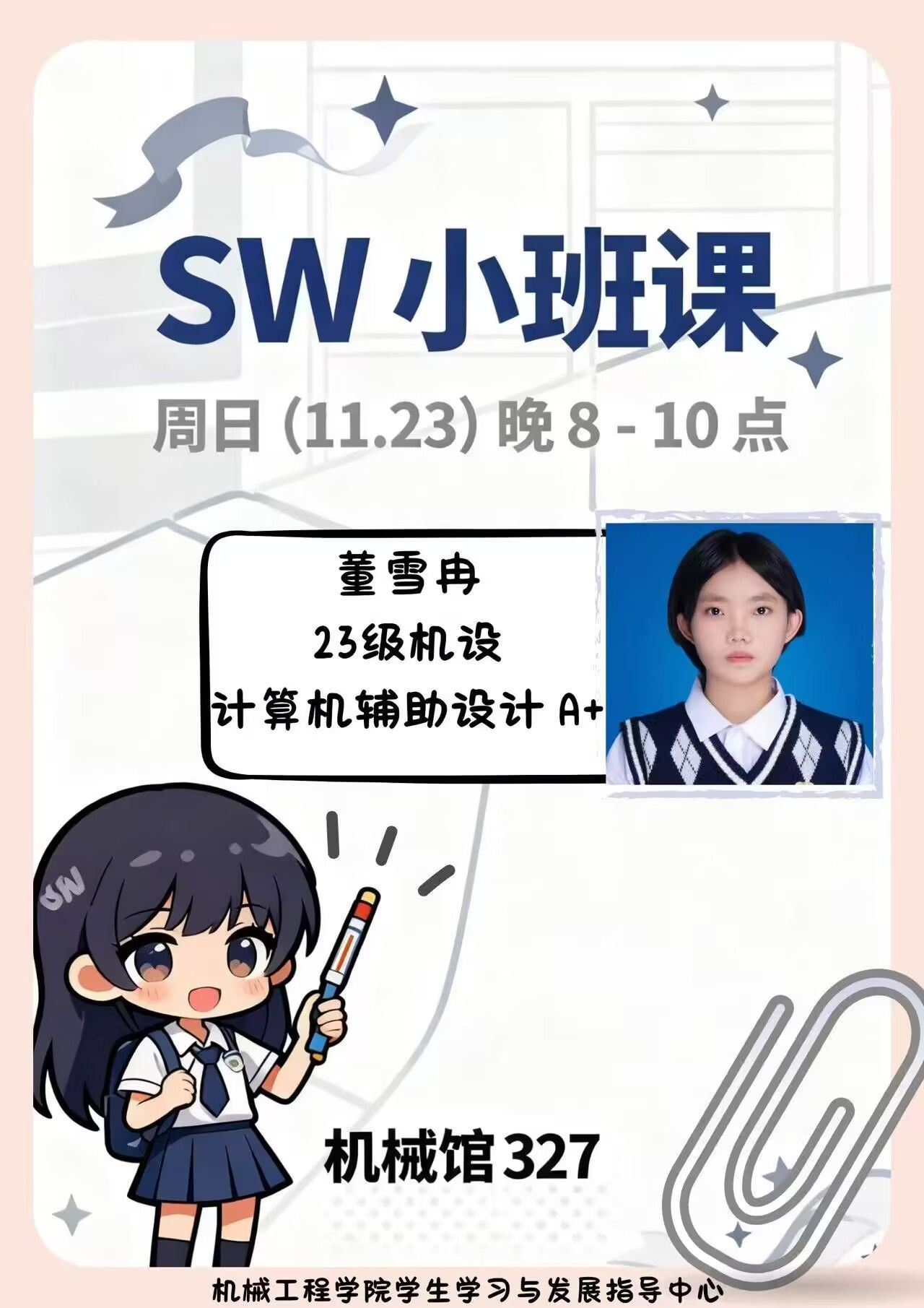 为帮助同学们更好地掌握SolidWorks软件的知识要点,提升期末备考效率,11月23日晚,机械工程学院学生学习与发展指导中心在机械馆327成功举办了第三期“风华启航计划”SW小班课的专场辅导活动,主讲人为2023级董雪冉同学。