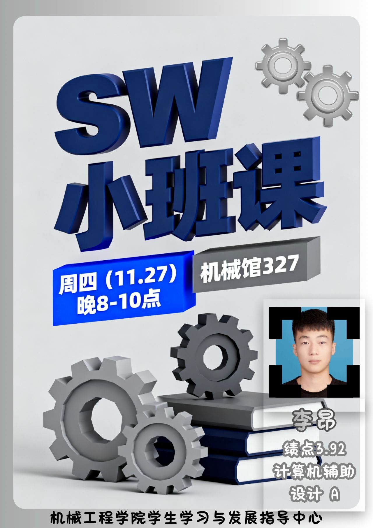 为帮助同学们更好地掌握SolidWorks软件的知识要点,提升期末备考效率,机械工程学院学生学习与发展指导中心分别于11月27日和28日晚19:00,在机械馆327邀请李昂同学和郅旭日同学作为主讲嘉宾成功举办了第三期“风华启航计划”SW小班课的专场辅导活动。