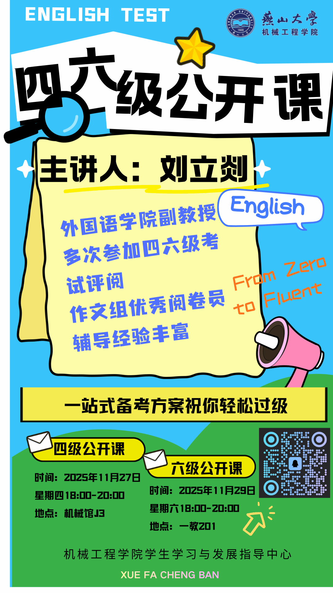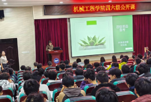 为进一步加强学风建设,帮助同学们提高四六级成绩,科学掌握备考方法,及时做好学业规划,机械工程学院学生学习与发展指导中心成功举办了四六级公开课活动。四级公开课在机械馆J3于11月27日18:00举办,六级公开课在第一教学楼201于11月29日18:00举办。此次公开课邀请了外国语学院副教授刘立剡作为主讲嘉宾,刘老师曾多次参与四六级考试评阅工作,并荣获“作文组优秀阅卷员”称号,其丰富的辅导经验和独到的见解深受学生欢迎。公开课由机械工程学院辅导员陈嘉硕主持。