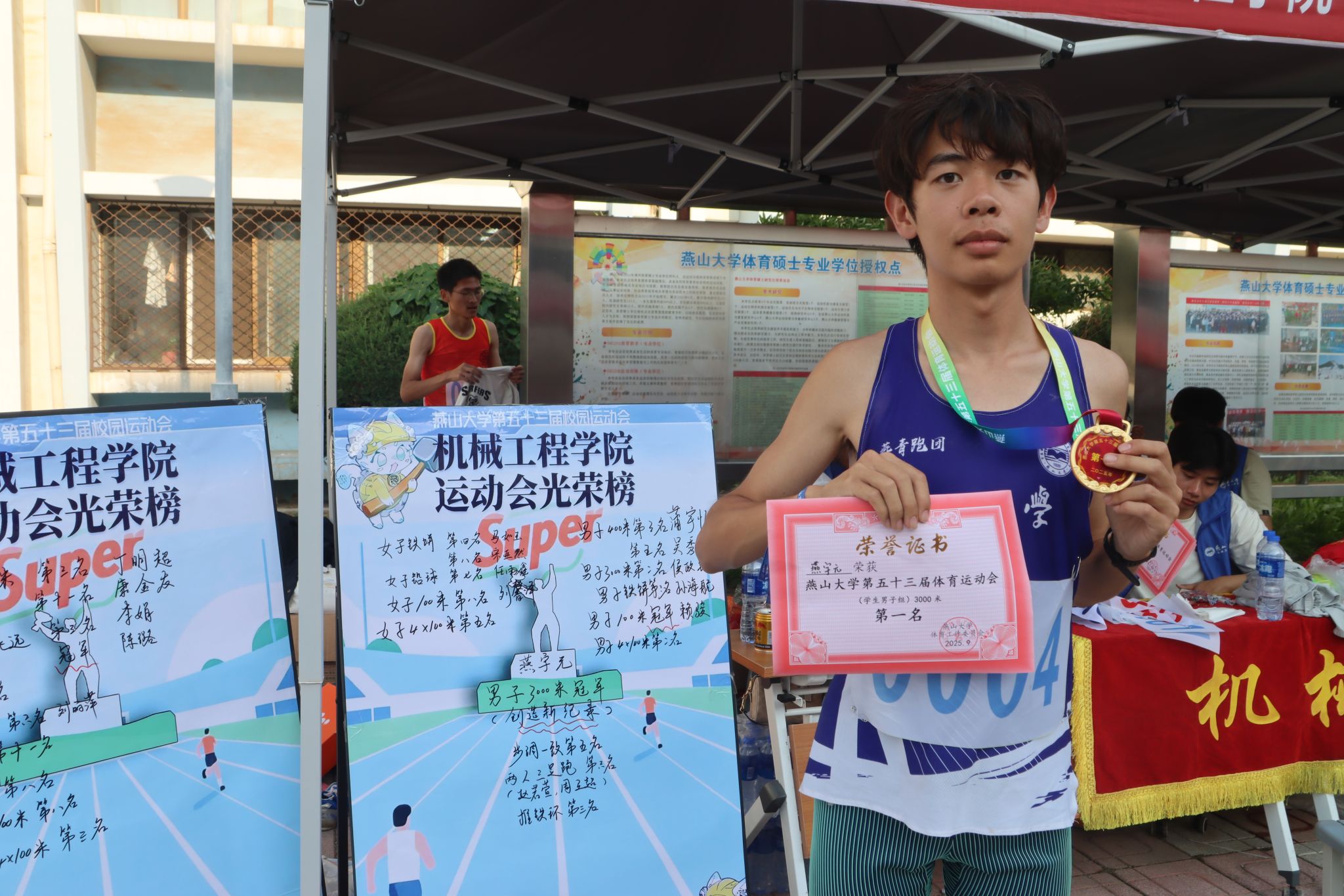 比赛期间,机械工程学院运动员在多个项目中取得优异成绩。学生组在男子3000米、男子100米、女子射箭、女子标枪、趣味运动项目龙卷风中斩获第一名,并在三级跳远、铁饼等项目中获得第二名、第三名的佳绩。尤为令人瞩目的是,2024级本科生燕宇元在男子3000米比赛中发挥出色,以9分43秒的优异成绩,成功打破了燕山大学长达44年之久的该赛事纪录,成为本届运动会中最受关注的亮点之一。本届运动会学生组共夺得金牌4枚、银牌5枚、铜牌6枚,总分378分。