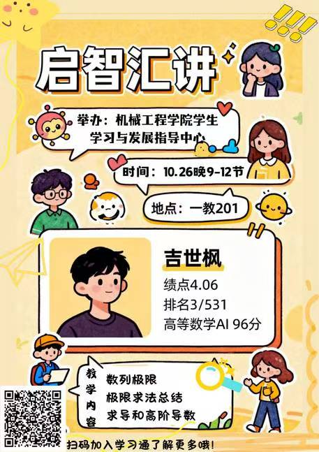 为进一步加强机械工程学院学风建设,激励学生积极备战高等数学期中考试,机械工程学院学生学习与发展指导中心于2025年10月26日在东区一教201教室,成功举办了高等数学启智汇讲活动,现场学习氛围浓厚,展现了学子们积极向上的学习风貌。