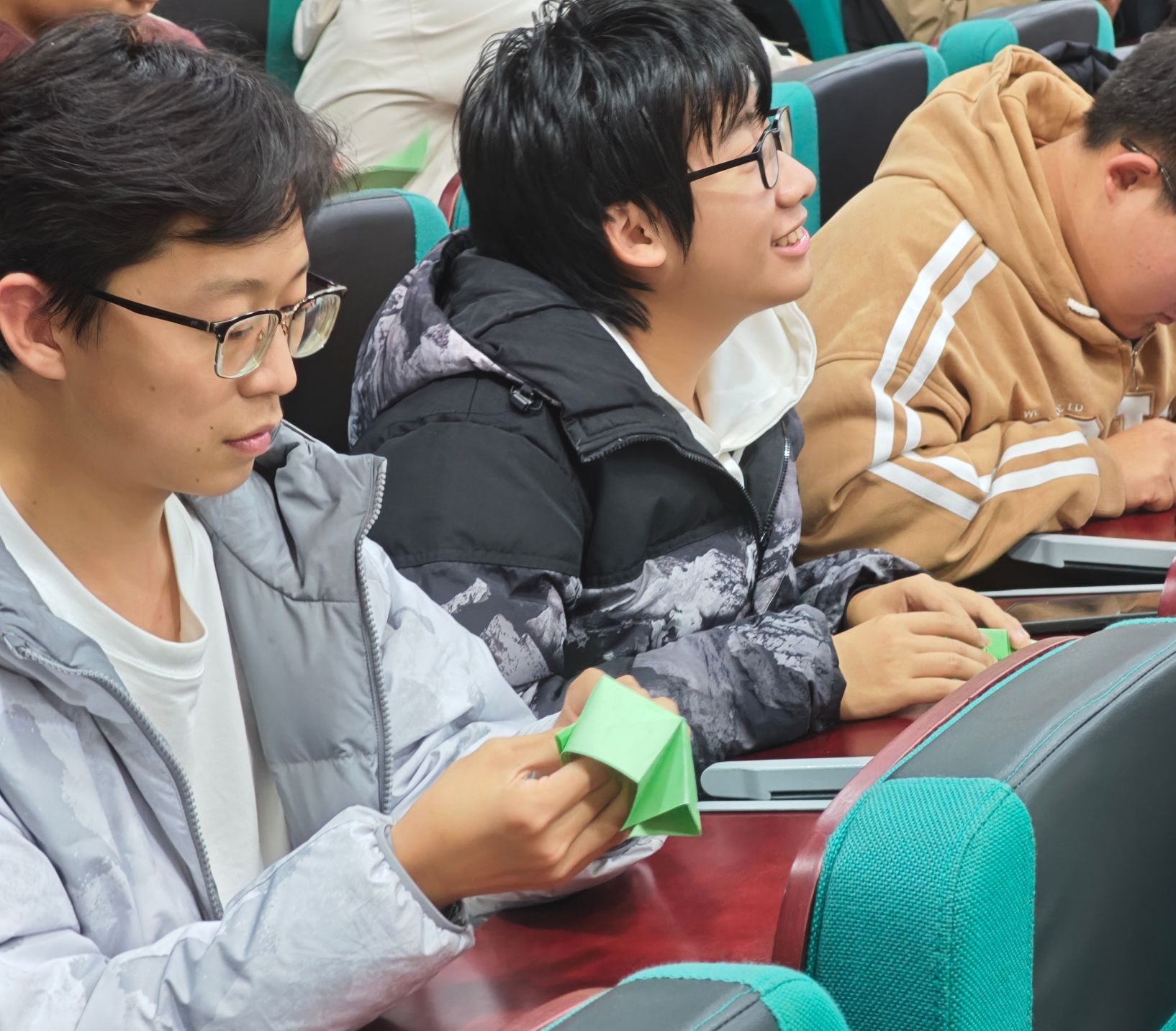 之后,陈嘉硕带领同学们共同完成了“折纸盒”的互动游戏,通过总结参考图、参考视频、拆解步骤等环节,引出大学学习生活阶段的各个环节——设立目标、榜样力量、具体措施以及阶段性复盘,并且在中途播放生动有趣的视频吸引同学目光,借此重点说明在大学学习过程中学会抵制诱惑的重要性,让“初心” 二字从抽象概念变得可感可触。