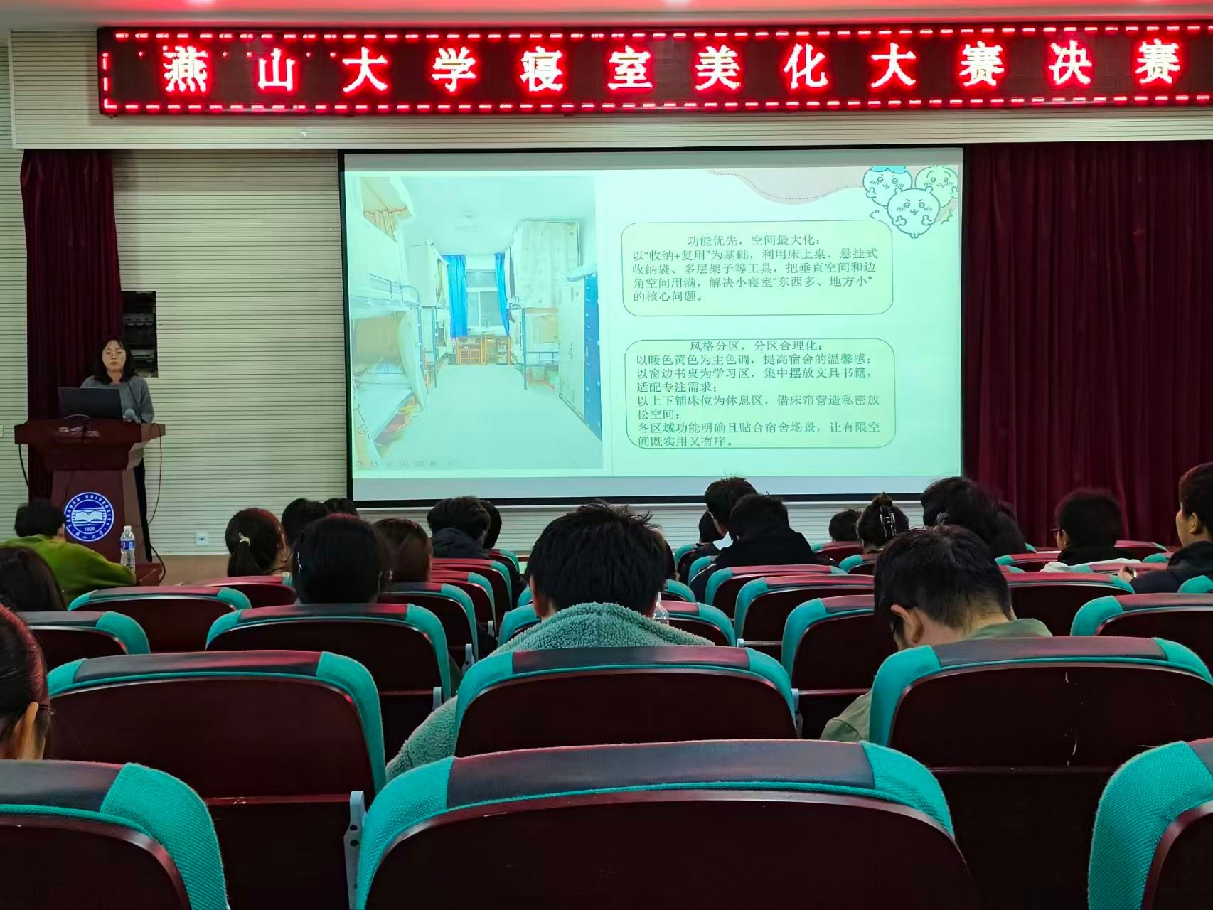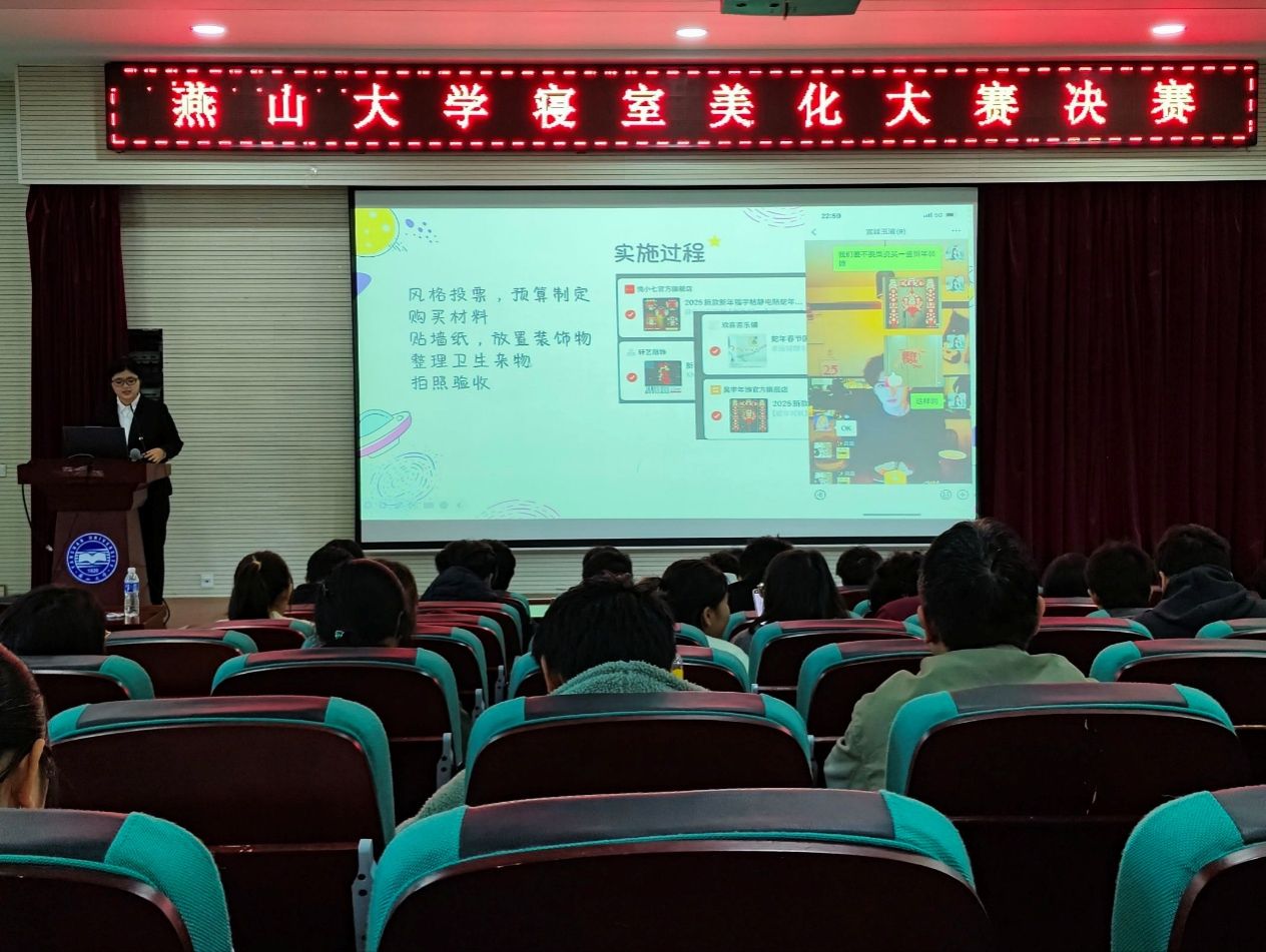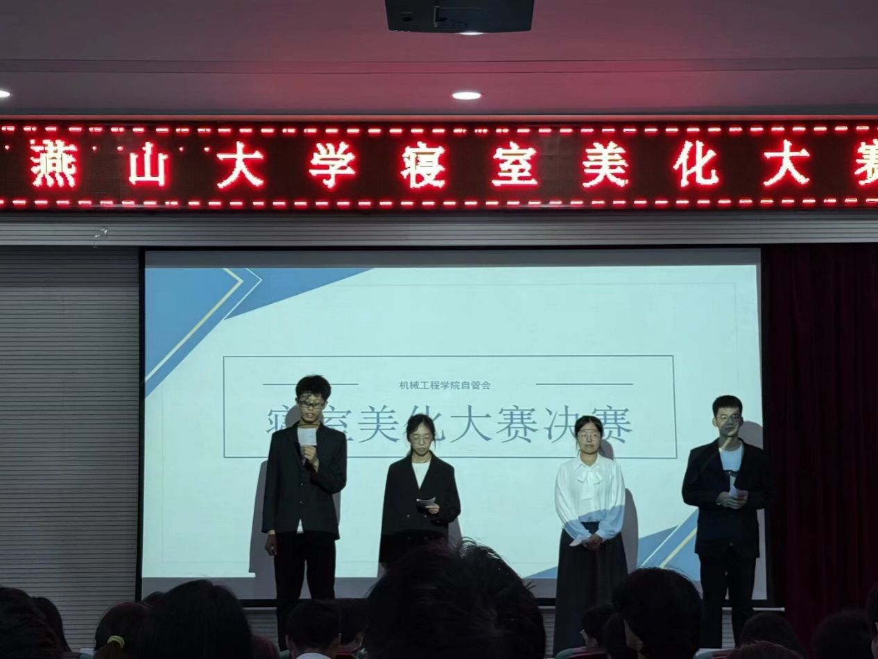 为进一步丰富校园文化生活,营造积极向上、温馨和谐和安全的寝室氛围。机械工程学院大学生自我教育管理委员会和“寓见风华”一站式学生社区共同承办了燕山大学寝室美化大赛。经过自愿报名、初赛、复赛等环节近1个月的筹备和激烈角逐,11月1日下午,寝室美化大赛决赛在机械馆J3举办,各学院学生干部评委和进入决赛寝室代表参加活动。