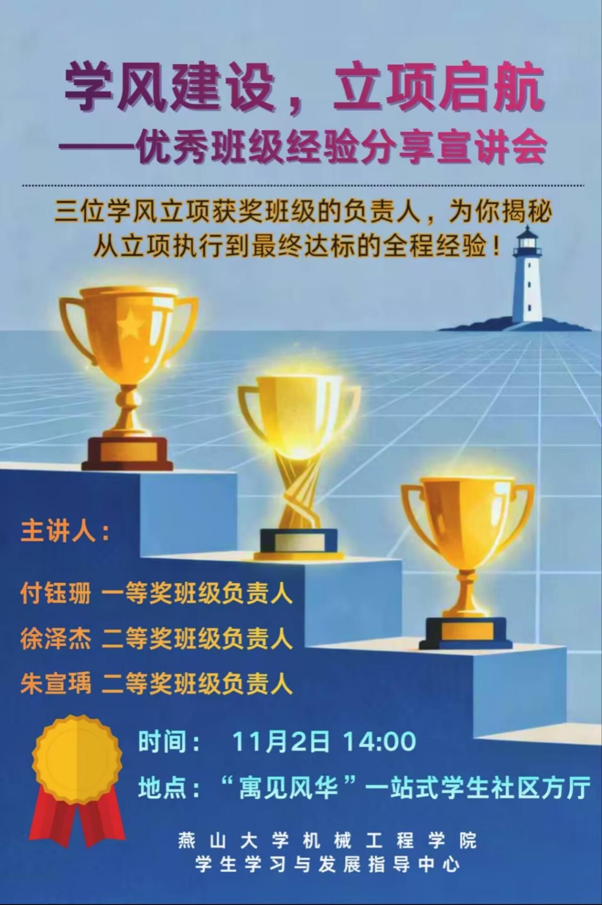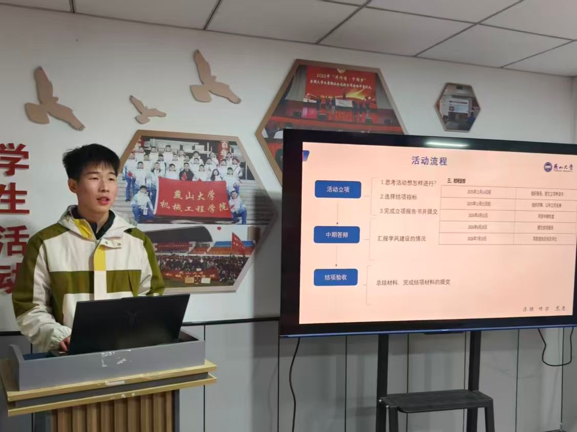 为深入落实学院学风建设工作部署,充分发挥学生主体作用,推动学院教育管理与学生自我教育深度融合,强化2025-2026学年学风建设立项工作落实,11月2日下午14:00,机械工程学院学生学习与发展指导中心在“寓见风华”一站式学生社区方厅成功举办“学风建设,立项启航”学风立项经验分享会。本次活动面向全院本科生,特别邀请往届学风立项获奖班级负责人分享经验,旨在帮助各集体科学立项、有效实施,营造积极向上的学习氛围。