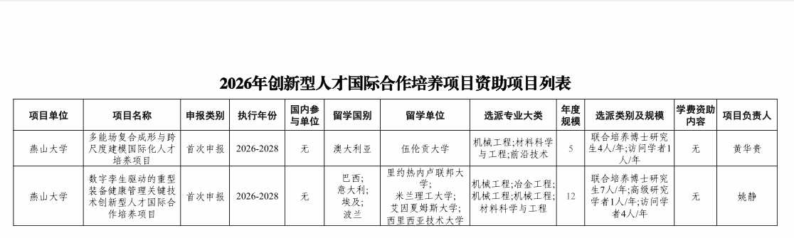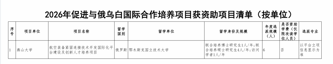近日,国家留学基金管理委员会正式公布2026年国际合作培养项目获批资助名单,我院共有2项创新型人才国际合作培养项目、1项促进与俄乌白国际合作培养项目获批。