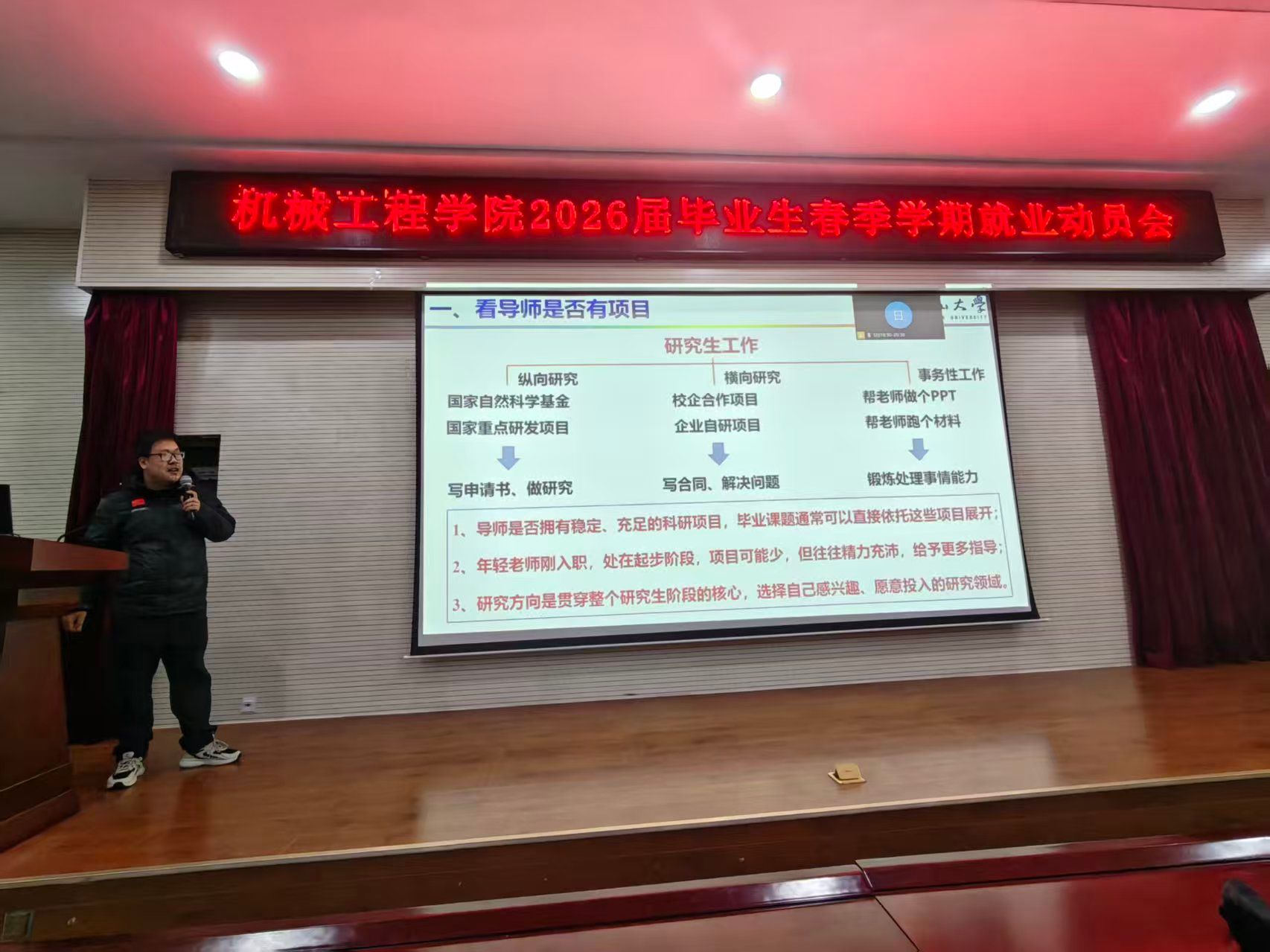 针对就业需求学生,学院把握关键时间节点,在机械馆J3召开 2026 届毕业生春季学期就业动员会,本次会议同时邀请学生家长线上参会。宋龙老师结合行业趋势与最新就业政策,通过对比近两年热门企业招聘数据,引导学生立足当下,合理调整就业预期,积极把握春招机遇;蔡伟老师则针对考研及调剂学生,详细讲解了研究生培养方案与调剂流程,建议准研究生们明确发展目标,充分利用资源,提升学术科研与综合实践能力。