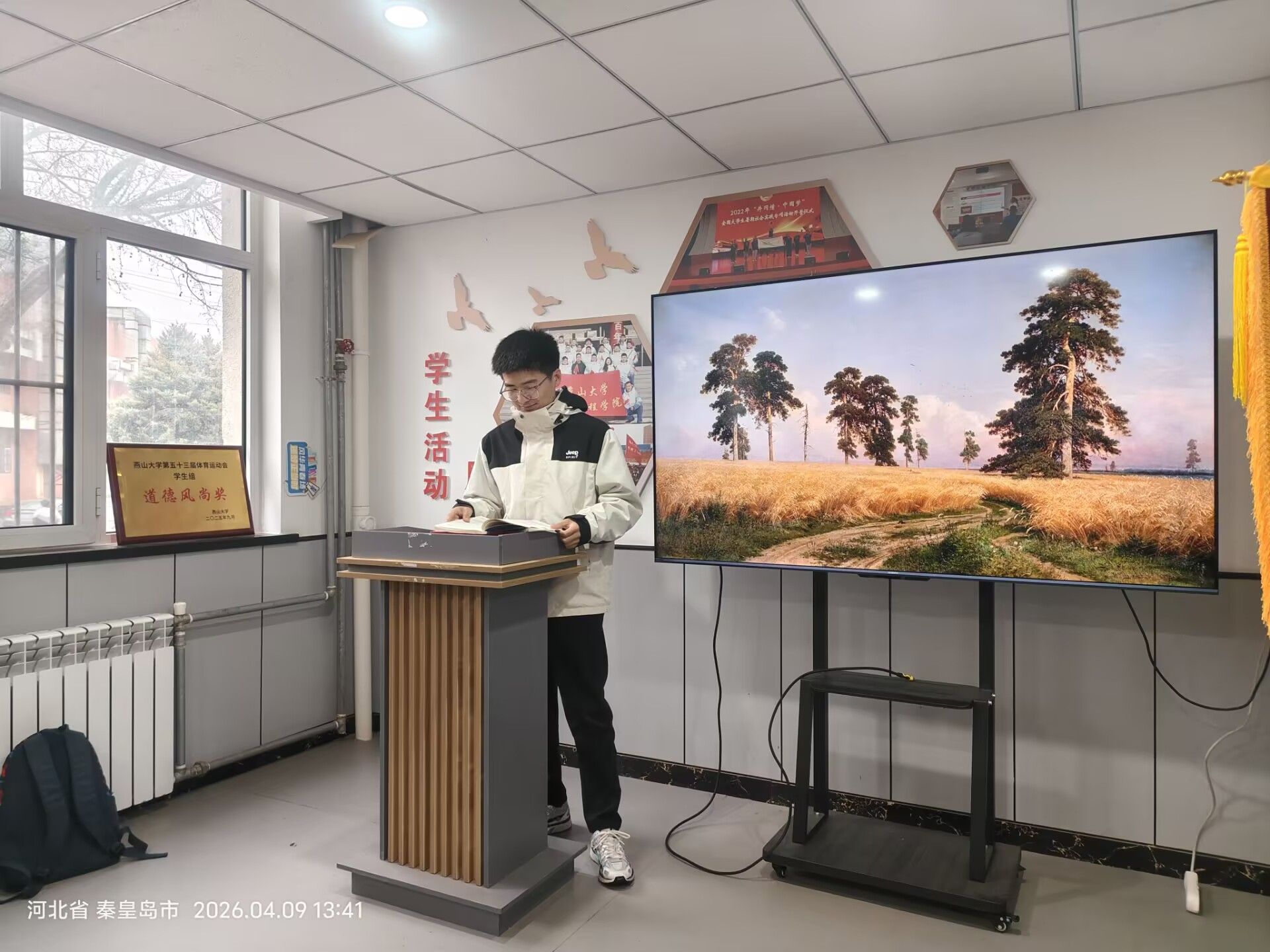 王嘉豪同学分享《梦圆大地》时,将袁隆平院士的“禾下乘凉梦”与“杂交水稻覆盖全球梦”娓娓道来,带领大家重温了这位“布衣院士”以稻穗为笔、以大地为纸的壮丽人生。他动情地讲述了袁老从安江农校起步,面对国际学界“水稻无杂种优势”的权威定论,顶着质疑与非议,在田间地头日复一日搜寻的故事。“最令人震撼的是,他历经上千次试验失败,终于在海南南红农场发现‘野败’雄性不育株,撬开了杂交水稻研究的关键突破口。”王嘉豪同学感慨道,袁老九十岁高龄仍坚持下田,将全部奖金投入科研,这份淡泊名利、心系苍生的赤子初心,正是“国士无双”的最好诠释。他号召同学们以袁隆平院士为榜样,扎根专业、脚踏实地,把个人梦想融入国家发展与民生福祉,在新时代的田野上逐梦山河、不负韶华。
