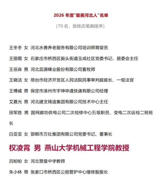近日,河北省委宣传部正式公布2026年度“最美河北人”宣传选树结果,我院权凌霄教授当选。