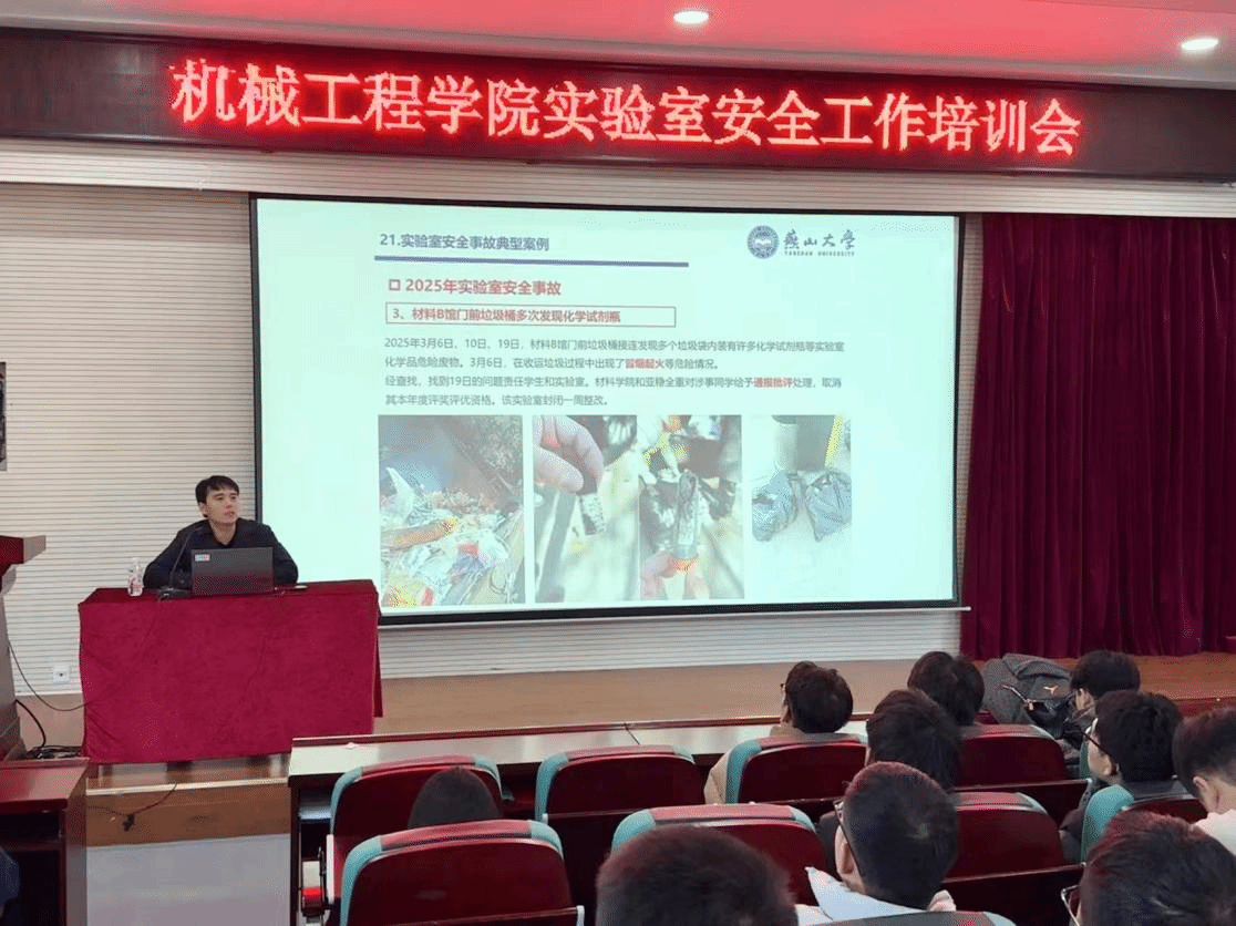 培训会上,王鹏主任结合近年来国内外高校发生的典型实验室安全事故案例,有针对性地分析了机械类实验室中常见的安全隐患与风险点,包括危险化学品管理、特种设备操作、高温高压实验、电气安全等方面。此外,会上还通报了今年来校内发生的多起实验室安全事件,包括管式炉着火、轧机碾伤、反应釜爆炸等现实案例,以此警示师生务必吸取教训,严格遵守安全规范。