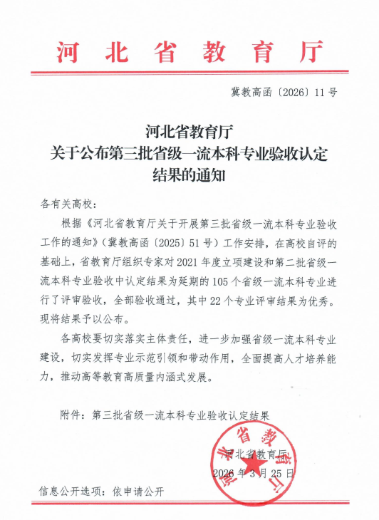 近日,河北省教育厅发布《河北省教育厅关于公布第三批省级一流本科专业验收认定结果的通知》(冀教高函(2026)11号),学院机器人工程专业通过验收并被认定为优秀。